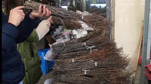 批发区门口一个商户的货架上,摆放了一堆形似枯槁的褐色“树枝”,被捆成直径约10厘米的一束,长近半米。走近看后,才能发现一个一个的花骨朵,“这个20块钱一把,插进水里,过个六七天就能开花。”她拿出手机展示开花后的样子:“像桃花一样。”她并不清楚这花的具体名字,只知道是一种杜鹃,“本地不产,产地在东北。”接着,她又补充:“这是野生的,更鲜活一些。”